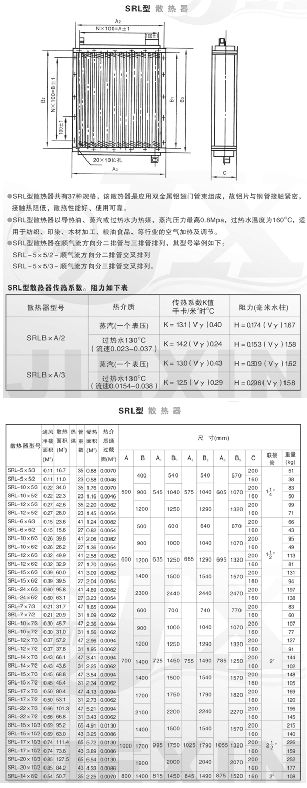 SRL型散熱器,是以蒸汽和130—70℃熱水為媒質,廣泛應用于工業建筑,民用建筑中采暖、局部采暖及熱風采暖,空調系統中作為空氣加熱用,并取得良好效果。